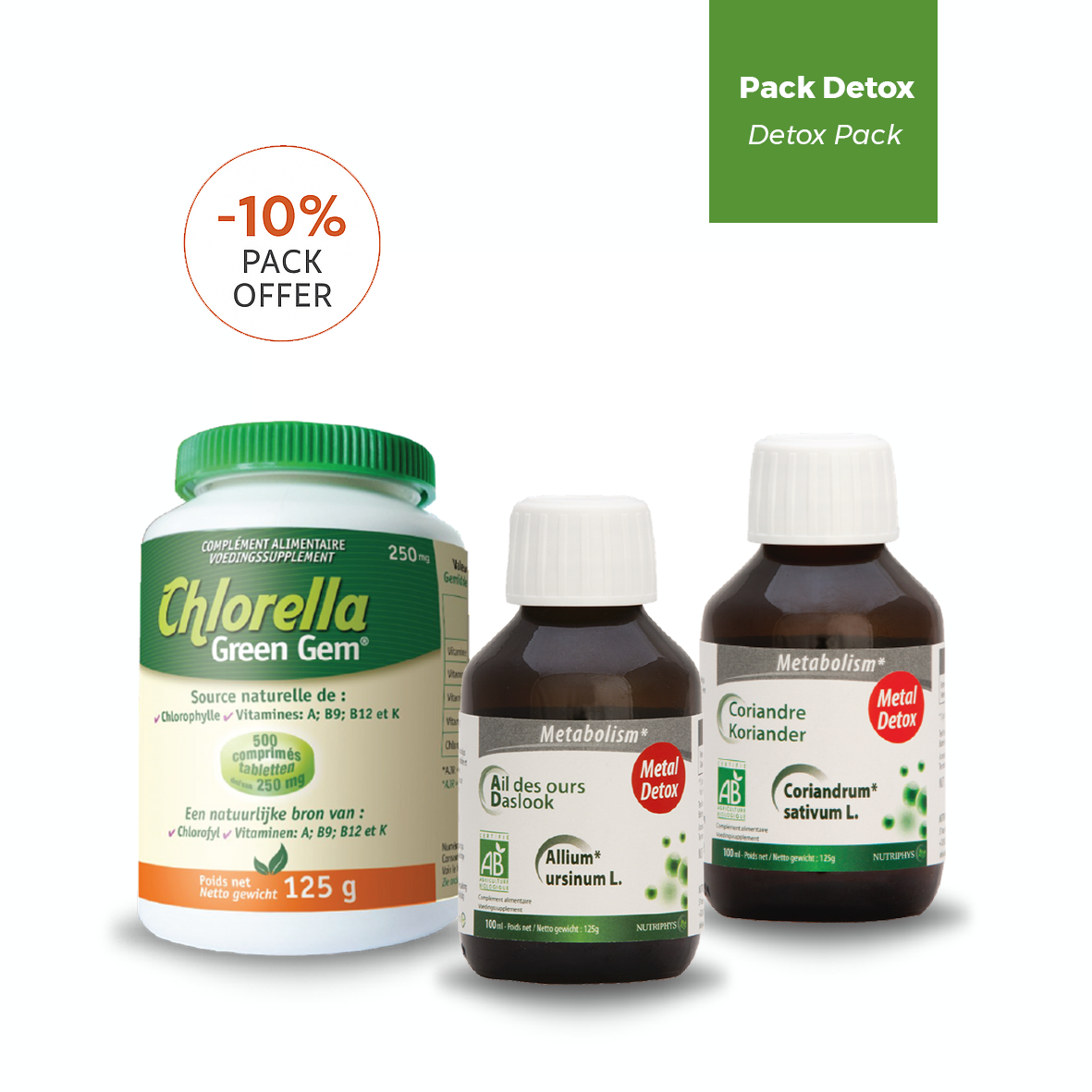 The Detox Pack brings together three natural Nutriphys supplements — Wild Garlic Mother Tincture, Chlorella Green Gem®, and Coriander Mother Tincture — to support detoxification, circulation, and overall metabolic balance.